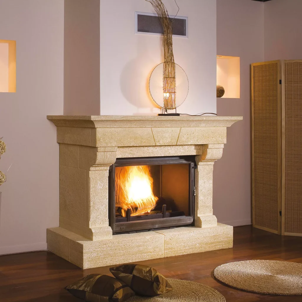 Cheminée simple face en pierre du Gard. Tablette moulurée. Modèle présenté avec foyer SUPER 9.