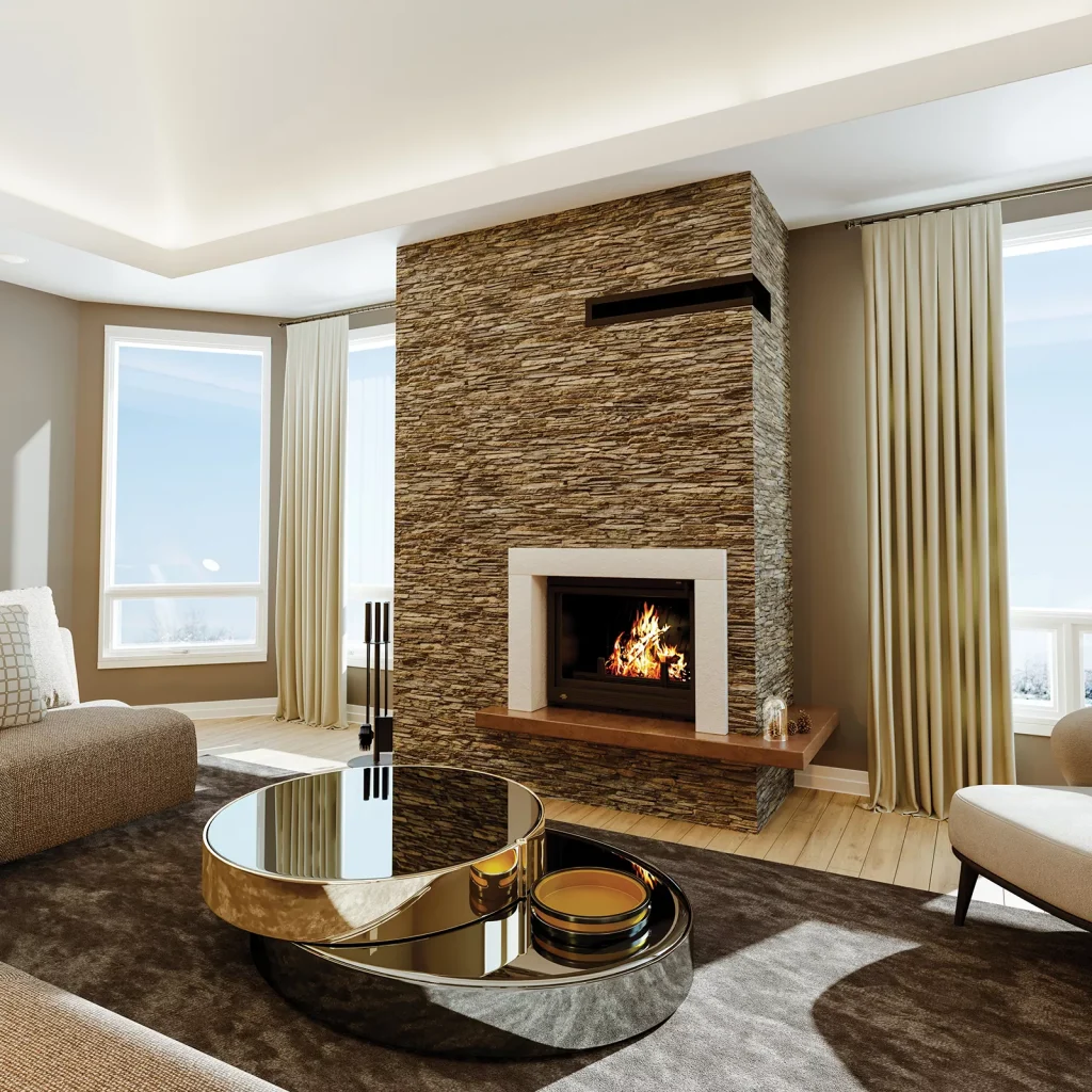 La cheminée ANTIOPE compose une architecture élégante où la matière et le confort se rencontrent. Son habillage en pierre Roma polie, aux nuances claires et à la surface douce, apporte une présence minérale lumineuse au séjour. La lumière des flammes vient glisser sur la pierre et en révéler les reflets subtils. La banquette à l’effet ciré marron prolonge la cheminée dans l’espace et invite naturellement à s’installer près du feu.