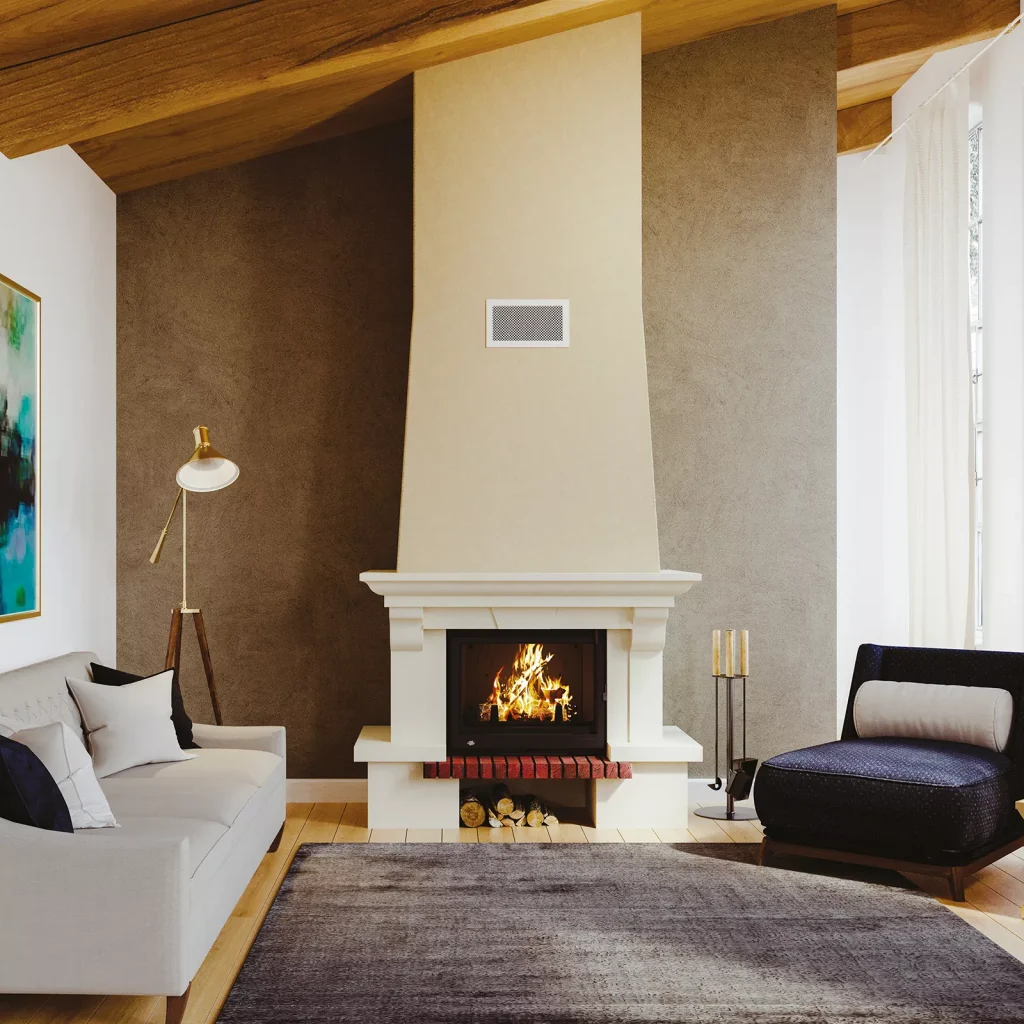 La cheminée DANOISE évoque le charme des intérieurs chaleureux où la matière raconte une histoire. La pierre d’Estaillades, claire et lumineuse, encadre le foyer avec élégance et met en valeur la finesse de la tablette moulurée. En contraste, les briquettes brun rouge apportent profondeur et caractère à la composition.