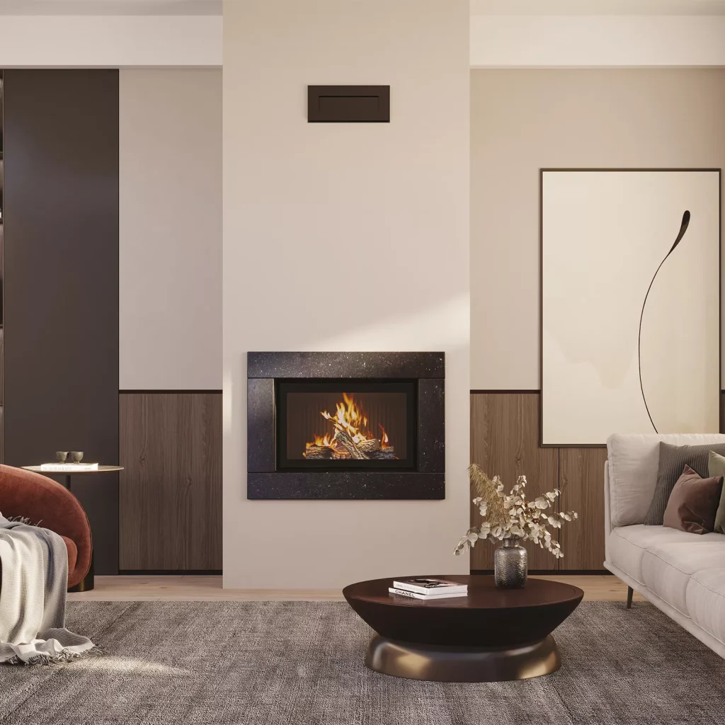 La cheminée KHATANGA s’inscrit dans une architecture contemporaine où la matière structure la vision du feu. Son cadre en pierre Kilkenny, aux teintes profondes et minérales, encadre la flamme avec caractère. Le coffrage aux lignes sobres met en valeur cette matière noble et laisse le feu occuper toute la scène.