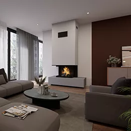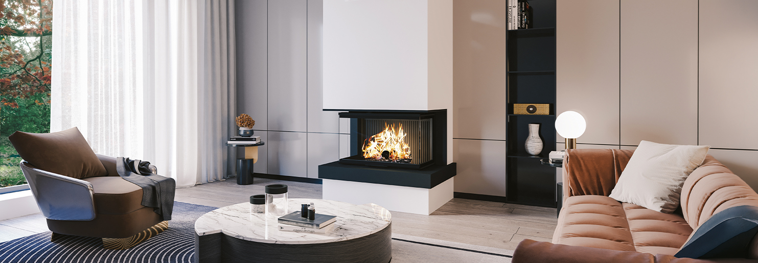 La cheminée YUZU met en scène le feu dans une architecture en épi trois faces qui ouvre largement la vision des flammes. Visible sous plusieurs angles, le foyer devient un véritable élément central de l’espace et attire naturellement le regard.