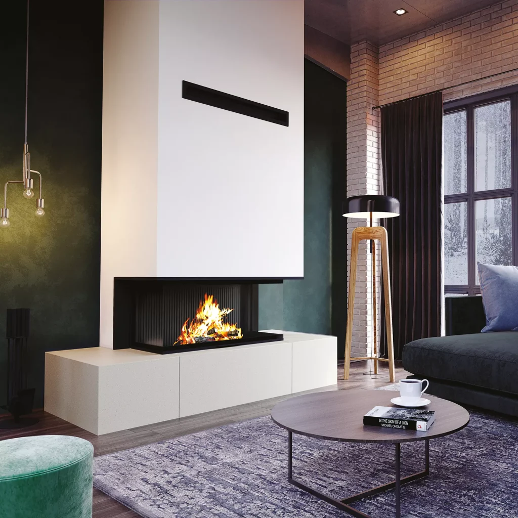 La cheminée NEVA met en scène le feu dans une vision trois faces ouverte sur le séjour. Le foyer semble reposer sur un socle en marbre Fjord, dont la matière profonde et élégante apporte une présence minérale raffinée.