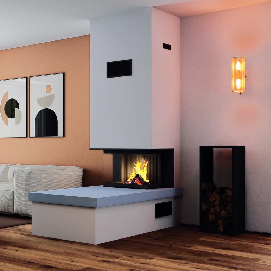 La cheminée YUZU met en scène le feu dans une architecture en épi trois faces qui ouvre largement la vision des flammes. Visible sous plusieurs angles, le foyer devient un véritable élément central de l’espace et attire naturellement le regard.