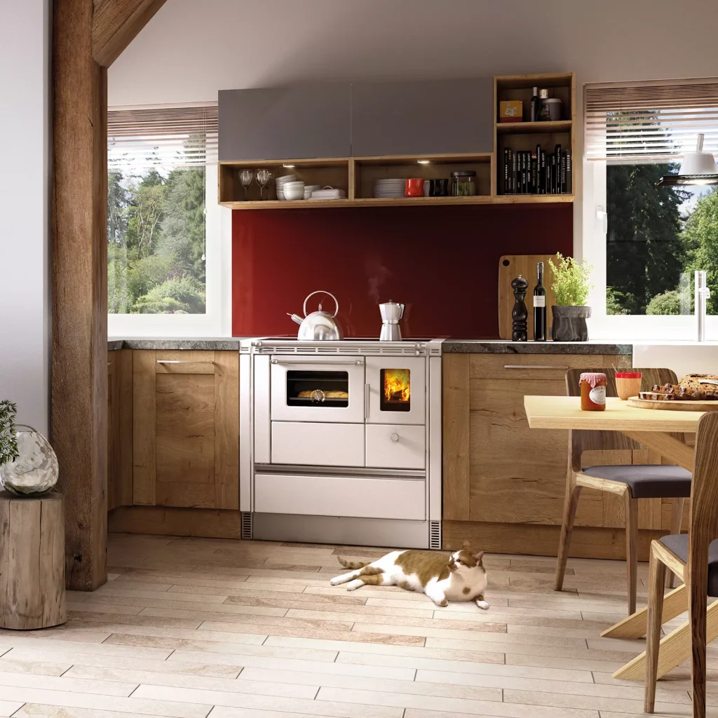 Son design aux lignes modernes et épurées s’intègre facilement dans différents styles de cuisines, tout en conservant l’esprit convivial et chaleureux de la cuisine au bois.