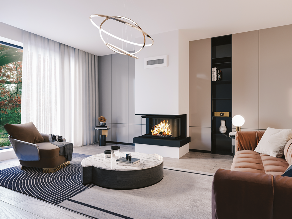 Pour un salon plus haut de gamme, inspirez-vous de la tendance japandi, qui mêle la sérénité japonaise à l’esprit cocooning scandinave. On conserve des lignes épurées et douces, on privilégie de belles matières sans multiplier les accessoires. Ici, la cheminée et la flamme se suffisent à elles-mêmes. Le mariage parfait entre élégance et chaleur, pour que chaque flambée devienne un moment de douceur et d’harmonie.