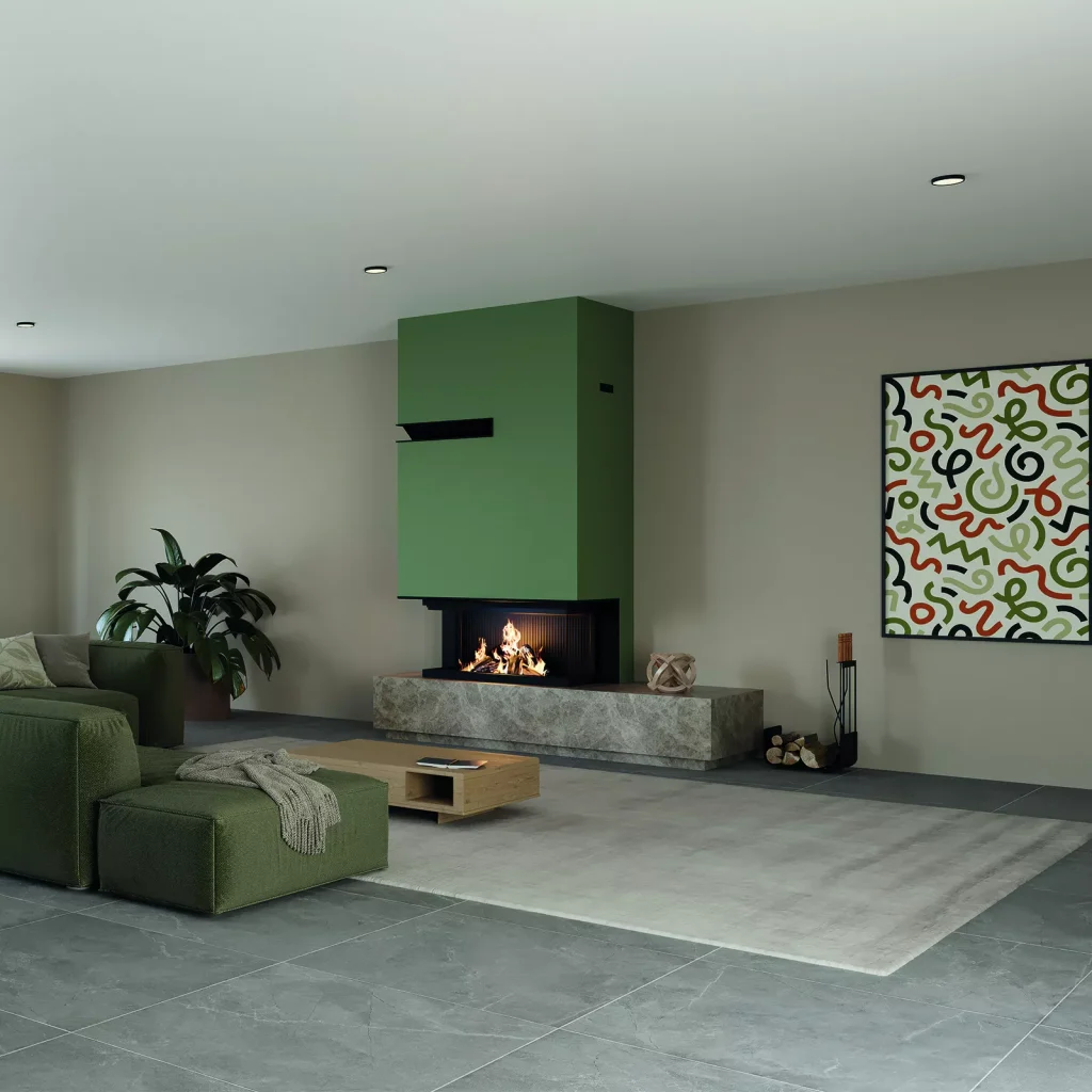 The PERLINE fireplace showcases the elegance of Perlado marble, an elegant stone with delicate veins and natural hues. Its three-sided design opens the fire onto the room, offering a generous view of the flames.