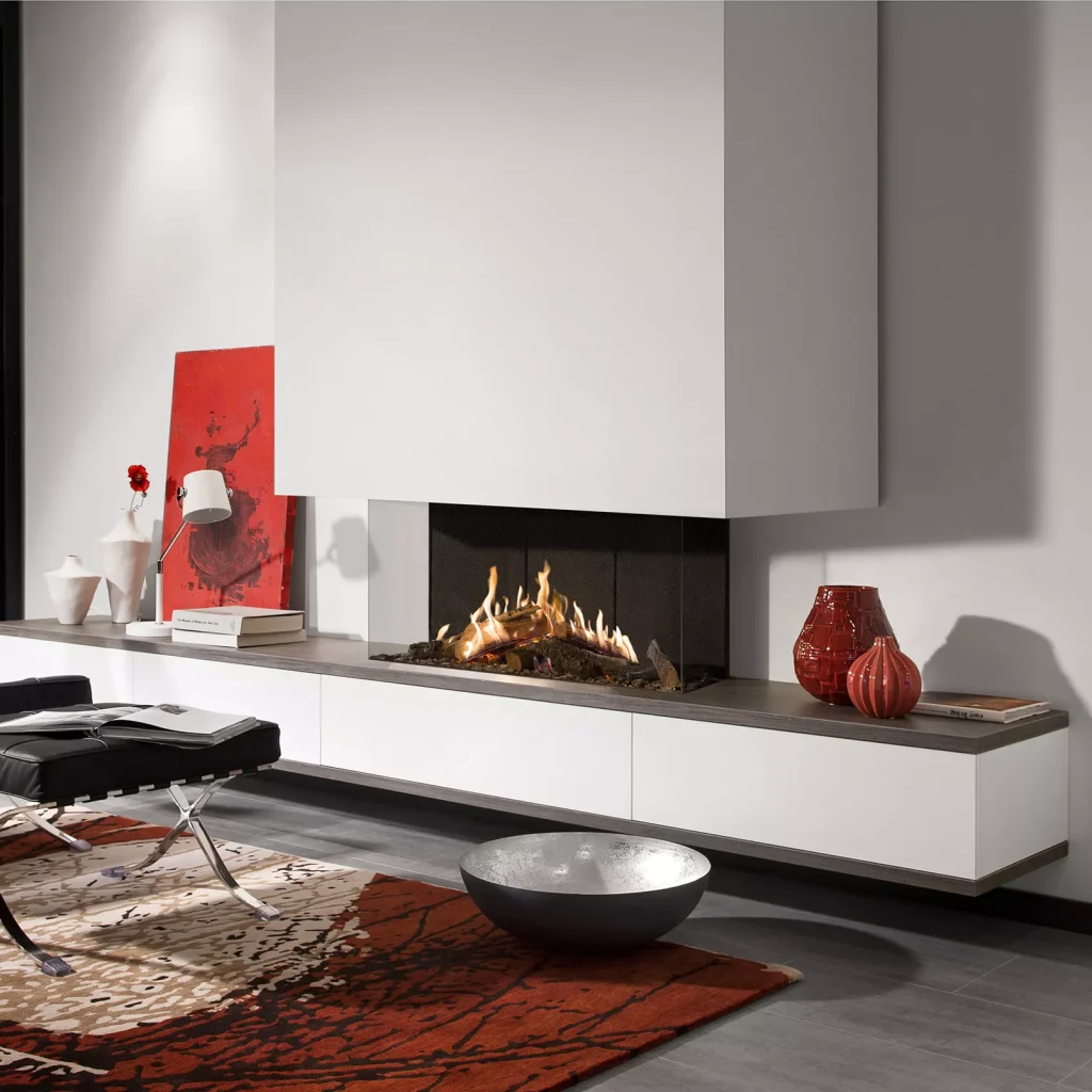 L’insert gaz SPLUS 1150/550 3 vitres offre une vision panoramique du feu grâce à ses trois faces vitrées, apportant modernité et élégance à votre intérieur.