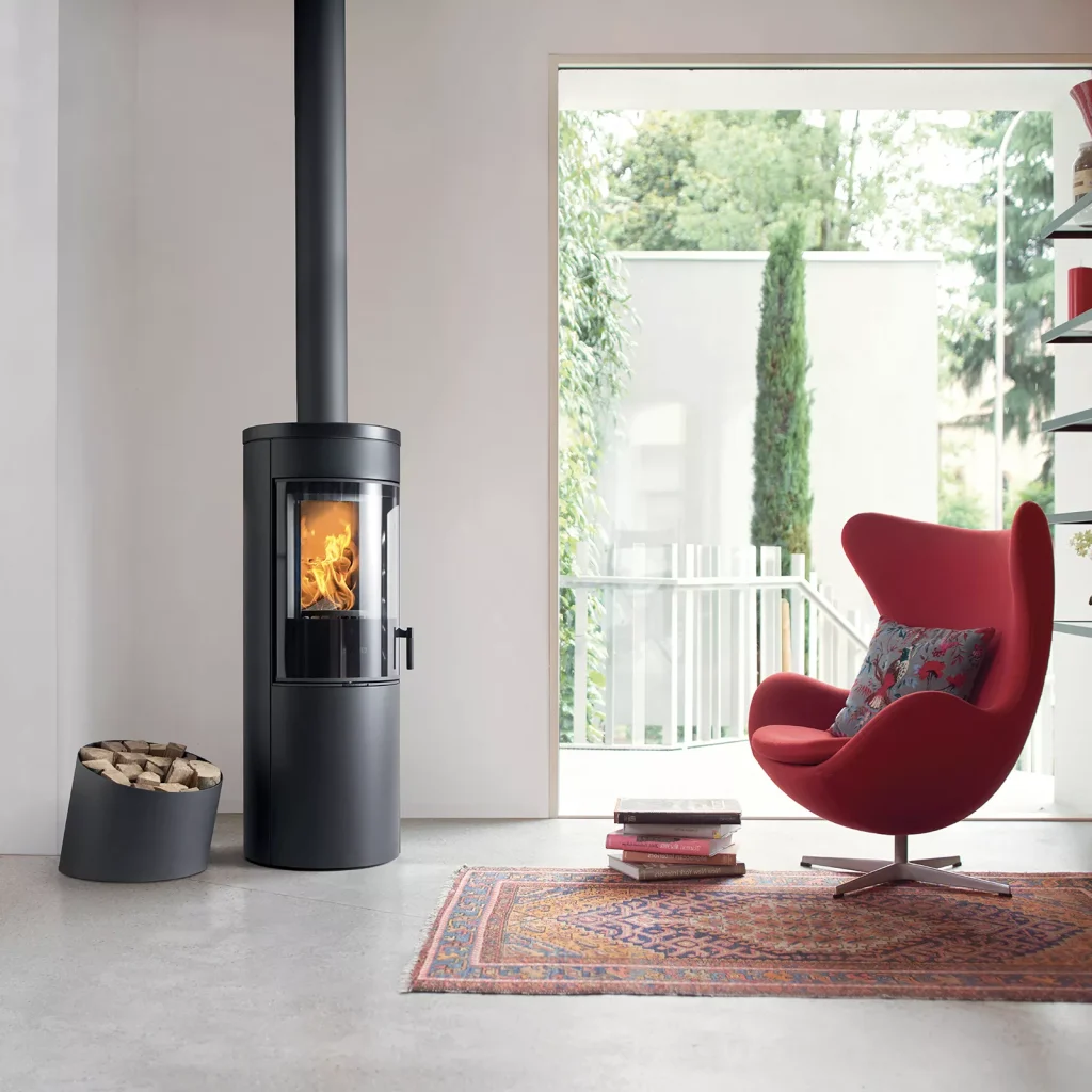 Le poêle à bois E124 A se distingue par son foyer rehaussé et sa vitre incurvée, offrant une vision maximale des flammes et un design moderne.